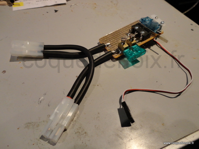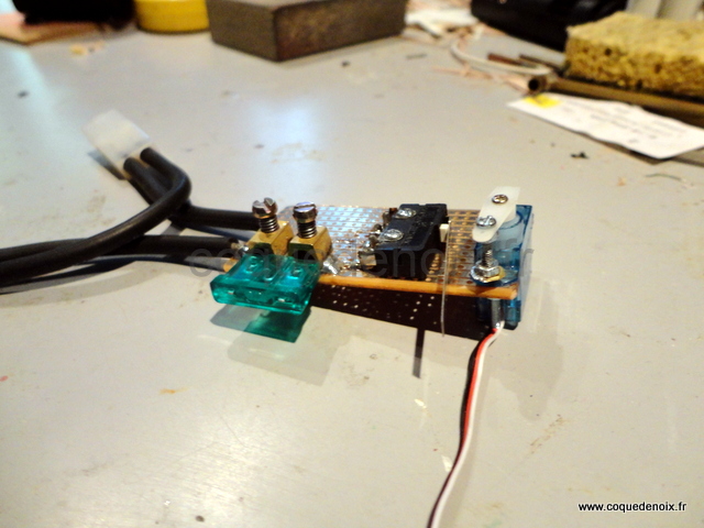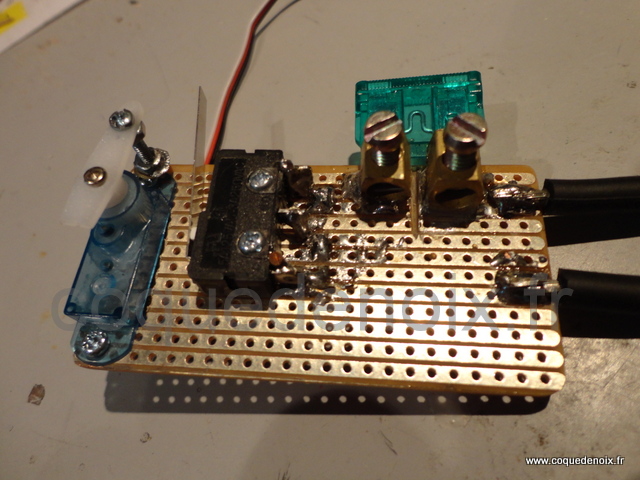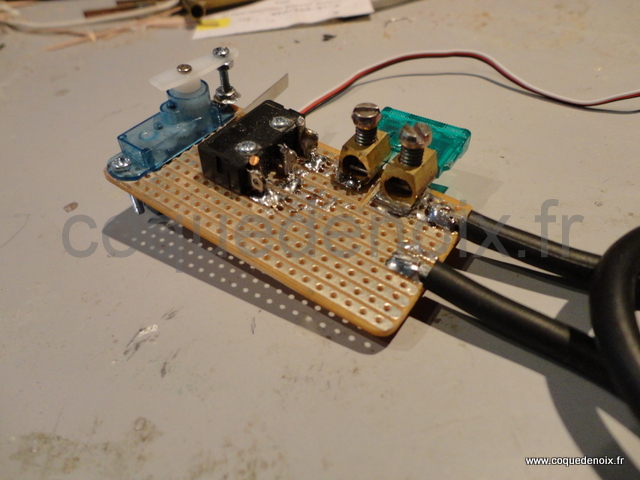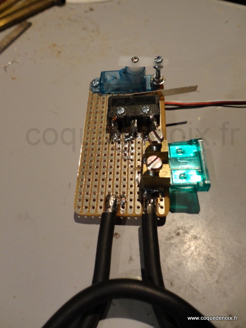 Pour éviter cela j'ai créé une petite platine équipée d'un fusible, un servo et un micro switch. Si le courant d'ampérage venait à être trop fort le fusible fond et le servo commute sur le microswitch. Le courant passe sur le deuxième circuit qui est branché en direct. Ainsi le courant est rétablie dans le variateur et le modèle peut revenir en douceur sur le bord du bassin.